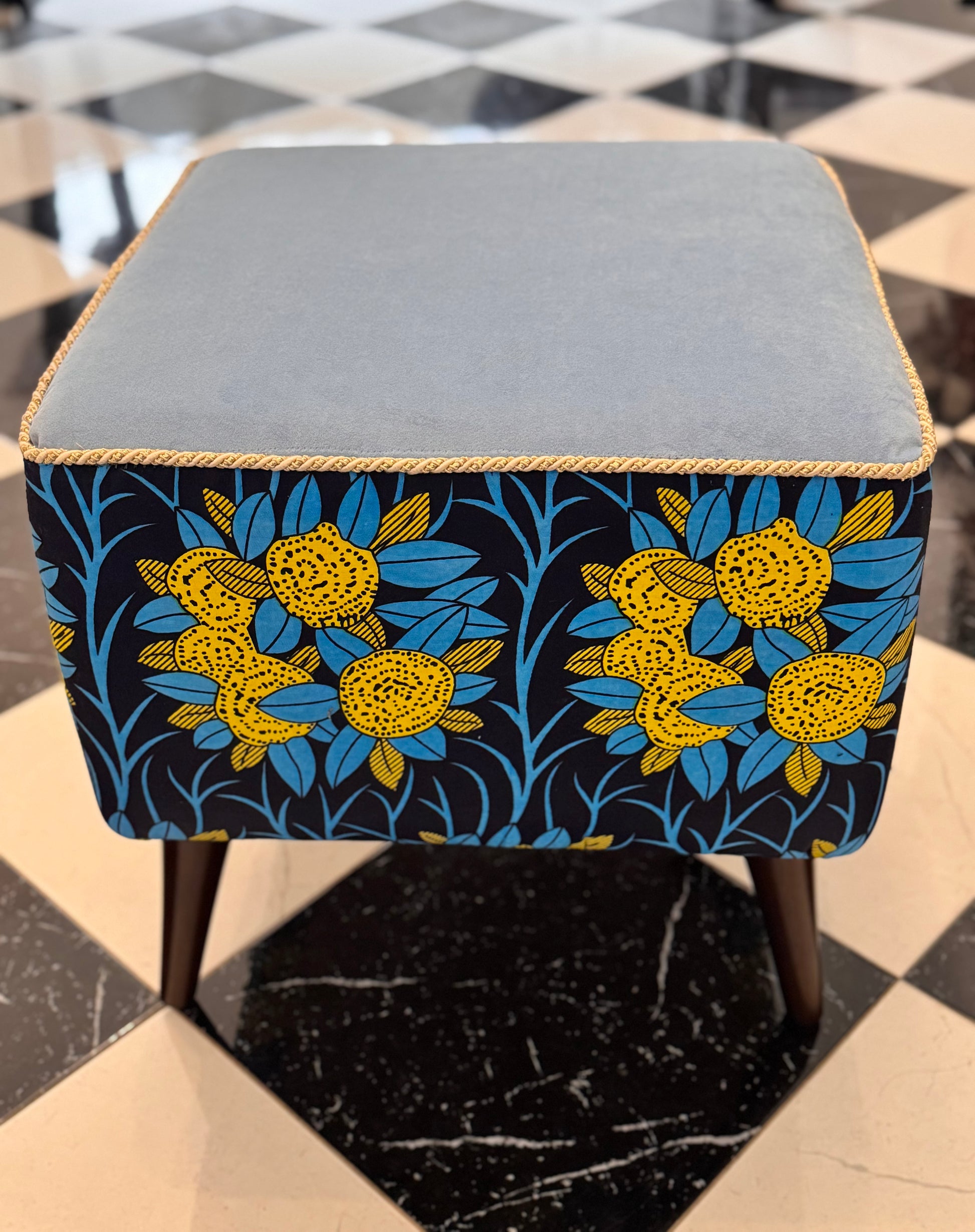 Tabouret au contour en tissu fleuri dans les tons de jaune, bleu clair et foncé
